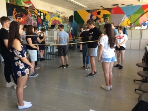 Dies sollte auch für die Gruppen-Performance von Bedeutung sein: In Zweier oder Dreier- Gruppen überlegten sich die Schüler, wie sie beliebige Gegenstände und die „neuen“ Medien, Stimme und Geräusche in eine einminütige Performance integrieren und damit und natürlich mit ihren Mitschülern interagieren. Auch hier geben Etienne und Julie Tipps und Tricks und fordern jede Gruppe auf, etwas, das sie jedem persönlich leise vorgaben, in ihrer Aktion zu ändern. Somit kommt jeder Schüler endgültig aus seiner Komfortzone hinaus und einzelne singen Popsongs oder Kinderlieder, andere verdreifachen die Geschwindigkeit ihrer Aktionen, andere hüpfen auf der Stelle und, und, und…