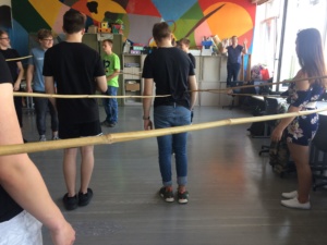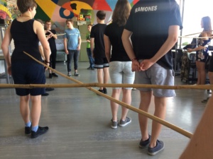 Dass es bei der Performance Art unter anderem um ein gutes Körpergefühl geht, kannte der Kurs bereits vom letzten Workshop und so sollte auch dieser beginnen: Nach einem allgemeinen Stretching-Programm bekommt zunächst jeder Schüler einen Bambusstab in die Hand gedrückt und soll sich einen beliebigen Punkt im Raum und eine Körperstelle suchen, zwischen denen er den Bambusstab einklemmen und für 10 Sekunden halten kann. „Change!“, tönt es mehrmals durch den Raum; die auffordernden Worte Julies, um die Schüler zu animieren, möglichst viele Möglichkeiten zu finden. Dies ist auch gleichzeitig eine kleine kreative Aufgabe.