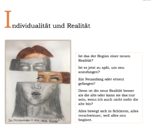 Emelie Siepert (Jahrgang 11) gestaltete nach einem Impuls aus dem Kunstunterricht von Frau Reimer-Nießen ein Magazin, zu dem viele andere Schüler aus ihrem Umfeld die unterschiedlichsten Beiträge geliefert haben. Diese Werke stammen nicht nur aus dem Bereich der bildenden Kunst, sonst auch aus dem Feld der Prosa und Lyrik, aber es gibt auch ganz praktische Tipps wie die Anleitung zum Nähen einer Atemmaske und das Rezept für einen Kuchen! Beim Lesen wird deutlich: diese Schüler versinken nicht in der Langeweile, versinken nicht in pausenlosen Computerspielen, verzweifeln nicht, sondern nutzen diese Zeit als Chance, über das eigene Leben nachzudenken, sich neu zu finden, neue Ziele anzusteuern!