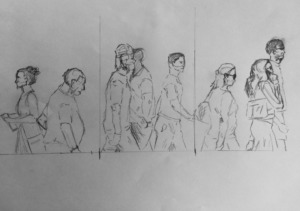Siehst du die Personen oder nur durch sie hindurch? Personen, die durch ihre Farben und Gefühle vereint sind, aber sich doch voneinander abwenden, bilden einen Kontrast. Denn manchmal sieht man im Leben erst auf den zweiten oder dritten Blick, was passt. Die Gruppe berichtet, dass die Farbwahl durch ihre Gefühle bestimmt wurden, welche sie beim Entwerfen hatten.