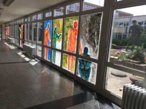Kunstgeschichtlich gesehen beschäftigt sich die Figurenmalerei des 11er Kunstkurses mit der expressiven Formensprache der „jungen Wilden“. Diese international sehr bekannte und erfolgreiche Malerei in den 1980er Jahren wurde u.a. von Rainer Fetting und Barbara Heinisch vertreten. Heinisch nutzte genau wie der Kurs von Frau Stolley-Martens die Transparenz einer Leinwand, um die Umrisse ihrer Modelle zu übernehmen. So sind sehr bewegte und ausdrucksstarke Figuren in abstrahierter Form und expressiver Farbigkeit entstanden. Weitere Informationen: https://www.barbara-heinisch.de          https://de.wikipedia.org/wiki/Rainer_Fetting