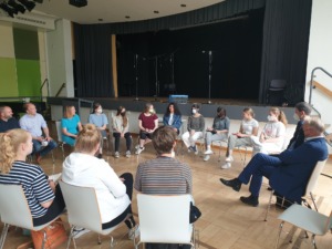 Zu Beginn der Gesprächsrunde stellte Frau Vieweg den Werdegang der AG vor, die zunächst als 5-tägiges Projekt „Schule ohne Rassismus“ innerhalb der Projektwoche im Juli 2019 unter der Leitung von Frau Vieweg stattfand. Während der Projektwoche wurde an verschiedenen Themen, wie zum Beispiel Alltagsrassismus, Zivilcourage und Antisemitismus gearbeitet. Zum Schulfest, als Abschluss der Projektwoche, konnten 702 Unterschriften aus der gesamten Schulgemeinschaft (von damals ca. 960 Mitgliedern) gesammelt werden, als Plädoyer, sich gegen jegliche Form von Rassismus zu positionieren und jährlich ein schulgemeinschaftliches Projekt zu einem bestimmten Thema durchzuführen. Der Gründung der AG „SoR – SmC“ im Februar 2020 (bestehend aus drei aktiven Mitgliedern und einigen OberstufenschülerInnen, die im Hintergrund mitarbeiteten) folgte, aufgrund Corona bedingter Zwangspause, die Neu-Gründung der AG im Schuljahr 2021/22 mit neun Mitgliedern und kontinuierlichen Sitzungen zu thematischen Schwerpunkten (z.B. Menschenrechte) und dem Fokus auf der Organisation des ersten Projekttages, der nun jährlich am 27.Januar, dem Holocaust-Gedenktag, stattfinden soll.