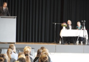 Um Punkt 10 Uhr begann der Zeitzeuge, der in Begleitung seiner langjährigen Unterstützerin und Ehefrau Dagmar Buterfas-Frankenthal nach Ilsede gekommen war, seinen Vortrag vor rund 400 Schülern in der voll besetzten Aula (weitere 1000 Schüler*innen anderer Schulen des Landkreises waren per Livestream zugeschaltet). Diesen stellte er unter die Prämisse, dass es ihm nicht darum ginge, den anwesenden Schülerinnen und Schülern „Schuld aufzuladen“, sondern vielmehr anhand seiner Erfahrungen zu verdeutlichen, zu was Diskriminierung, Rassismus und Antisemitismus führen könne.