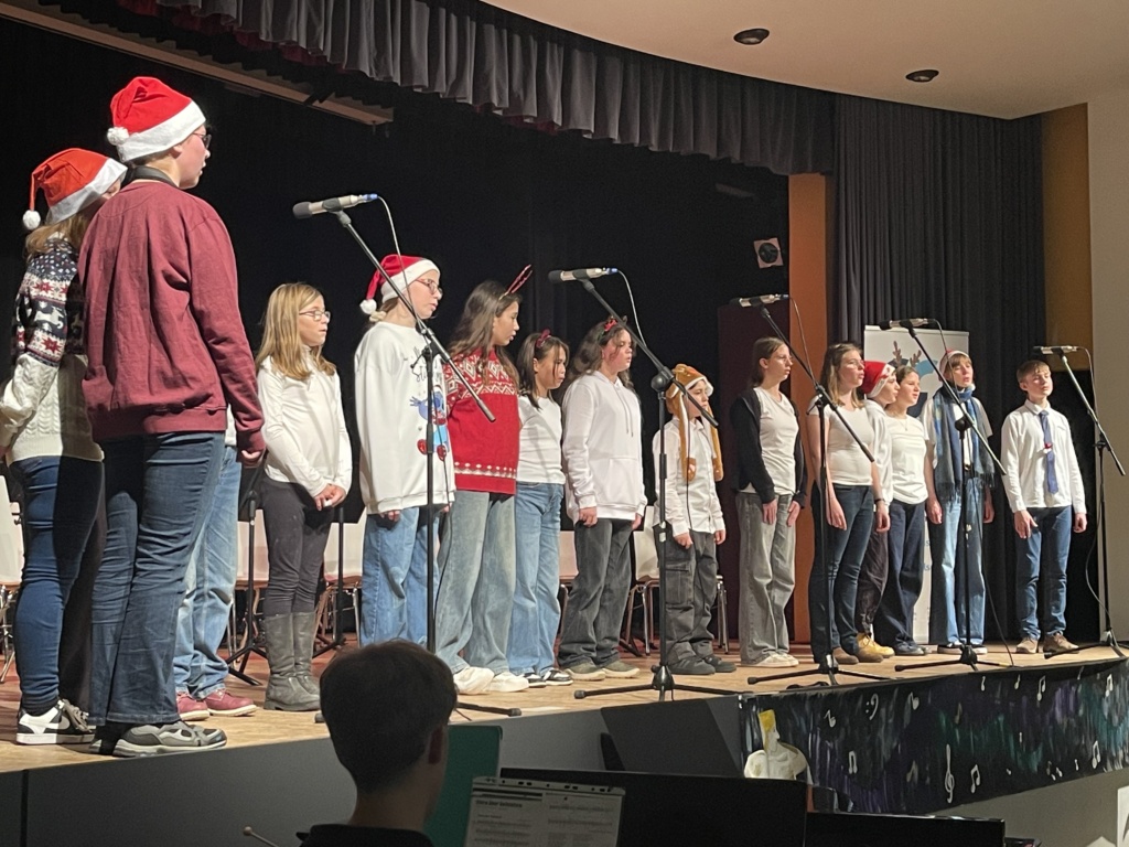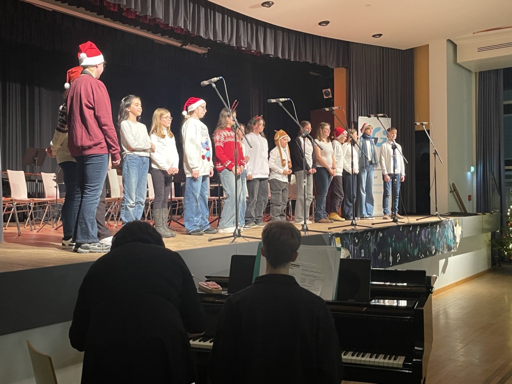 Im direkten Anschluss an den Adventsbasar fand am 28.11.2025 um 17 Uhr das Adventskonzert, das die Fachgruppe Musik organisiert hatte, in der Aula des GGI statt. Auch hierbei konnte das Publikum so richtig in Adventsstimmung versetzt werden. Begrüßt wurden die über 300 Gäste mit „Hört der Engel heller Lieder“ vom Chor („SinGGing Voices“) unter der Leitung von Frau Ludwig und anschließend durch unseren Schulleiter Herrn Holtusen. Im späteren Verlauf des Konzertes boten die „SinGGing Voices“ noch weitere weihnachtliche Lieder dar, begleitet am Klavier von Tibo Laufer. Letzterer hatte im Sommer am GGI das Abitur abgelegt und im Rahmen seines FSJ bei der Kreismusikschule die wöchentlichen Proben unseres Chores pianistisch unterstützt und sogar noch eine eigene Komposition solistisch auf dem Klavier gespielt.