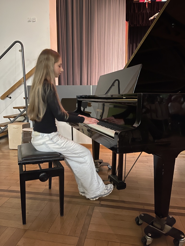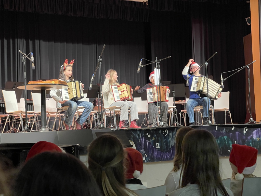 Ebenfalls auf dem Klavier solistisch zu hören waren Charlotte Orthwein (Klasse 5.3), Björn Strichow (Klasse 5.2), Elisabeth Schmidt (Klasse 7.2), Doha Alhalake (Klasse 8.2), Jonte Volling (Klasse 9.3), Bruno Vieweg (Klasse 8.5) und Helin Savas (Klasse 9.3). Eva Jentsch und Lea Küster aus der Klasse 6.3 verwiesen mit dem Titel „Feuerwerk“ von Wincent Weiß, welchen sie mit Klavier, Cajon und Gesang darboten, schon auf die Tradition am Jahresende. Im Musikunterricht entstand die Idee zusammen aufzutreten und so musizierten Leonie Wöckel (Geige), Anton Schatton (Gitarre) und Bruno Vieweg (Klavier) aus der Klasse 8.5 das bekannte amerikanische Weihnachtslied „Rudolph, the Red-Nosed Reindeer“ gemeinsam. Auch Mona und Roman Makus (12. Jg., 10.2) sowie Inga Möllring (10.3) hatten sich zu einem Gesangstrio zusammengeschlossen und musizierten das englische Weihnachtslied „God Rest You Merry, Gentleman“. Charlotte Bauer aus der Klasse 10.3 bereicherte das Adventskonzert ebenso mit ihrer barocken Musik, die sie auf der Querflöte gekonnt intonierte.