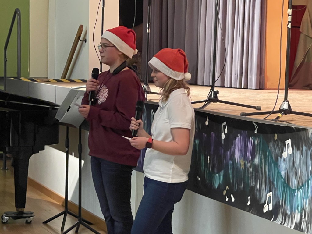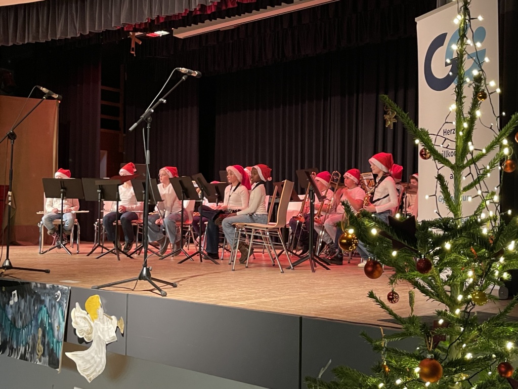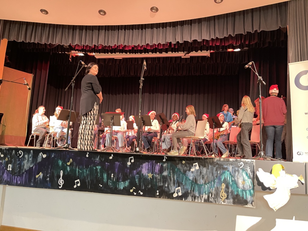 Insgesamt waren an diesem Abend fast 80 Schülerinnen und Schüler in der Aula aktiv. Alle musikalischen AGs des GGI musizierten auf der Bühne. Erstmals war auch die neugegründete AG Veranstaltungstechnik unter der Leitung von Herrn Spieler bei einem Konzert im Einsatz und sorgte dafür, dass alle Musikerinnen und Musiker gut zu hören und zu sehen waren. Durchs Programm führten diesmal vier Schülerinnen (Louisa Plumeier, Daria Nienhaus, Charlotte Rückum und Nele Borgwardt) gemeinsam mit Frau Jankowski. Auch die Gitarren-AG unter der Leitung von Herrn Brichta und die AG Instrumentenkarussell unter der Leitung von Frau Ladutko von der Kreismusikschule Peine musizierten jeweils ein Weihnachtslied. Die Beginner unseres Blasorchesters unter der Leitung von Frau Jankowski spielten zunächst ihr allererstes Musikstück, denn erst vor wenigen Wochen hatten sie ihr Instrument erhalten, um dann mit den Fortgeschrittenen noch einmal gemeinsam „Morgen kommt der Weihnachtsmann“ zu intonieren. Ein besonderes Highlight war sicherlich unser Fortgeschrittenen-Blasorchester unter der Leitung von Herrn Lempfer von der Kreismusikschule, welches sich an diesem Abend vor allem der Filmmusik verschrieben hatte. Zum Abschluss unseres Konzertes musizierten Chor und Blasorchester noch einmal gemeinsam mit dem Publikum „Oh du Fröhliche“. Vielen Dank an alle mitwirkenden Schülerinnen und Schüler sowie ihre AG-Leiterinnen und -leiter, aber auch an alle Eltern und Gäste. Viele Gäste spendeten am Ausgang der Aula nochmal für den guten Zweck (Ukraine und Sierra Leone), denn auch an andere zu denken, ist ein besonderes Anliegen des Adventsnachmittags am GGI.