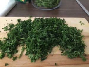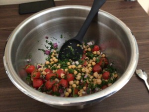 - Tomaten, Petersilie und Zwiebel zu den Kichererbsen geben und umrühren. Mit Kreuzkümmel und Salz abschmecken und umrühren.