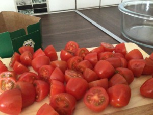 - Inzwischen die Tomaten waschen und klein schneiden. Die Cocktail-Tomaten halbieren.