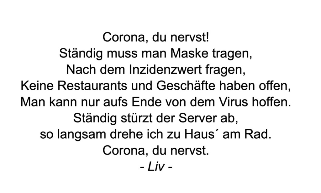 Corona, ein Virus, das viel Leid in die Welt bringt, sei es physisch oder psychisch. Alles steht still, die Welt ist grau und das bunte, lebensfrohe Leben ist weg.