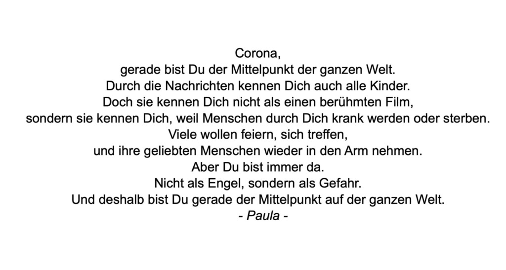 Vielleicht erinnerst auch du dich noch an das letzte Mal, als du mit deinen Freunden ganz sorgenfrei zusammen warst. Das Lachen, sich um nichts Gedanken machen, einfach das Leben lieben.. all das ist weg. Wir distanzieren uns voneinander, um sich zu schützen. Gerade die Schulzeit sollte unbeschwert und möglichst sorgenfrei sein. Und nun ist sie geplagt von Sorgen und Ängsten.